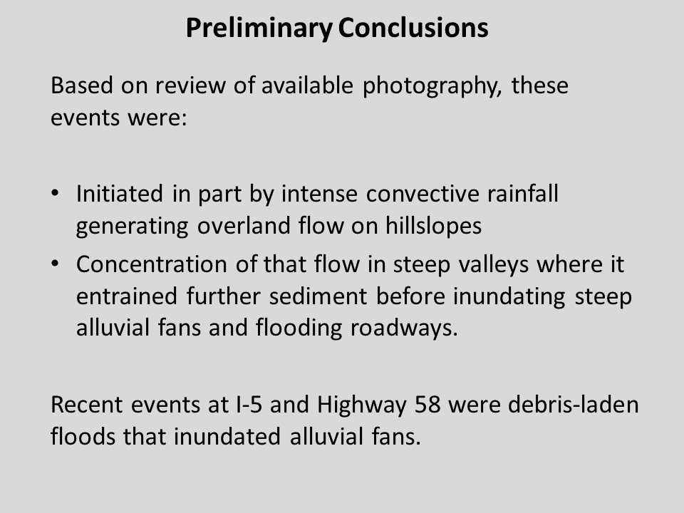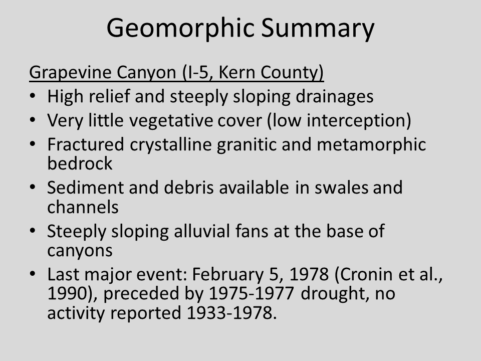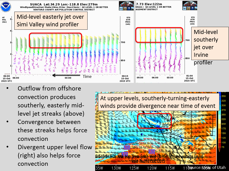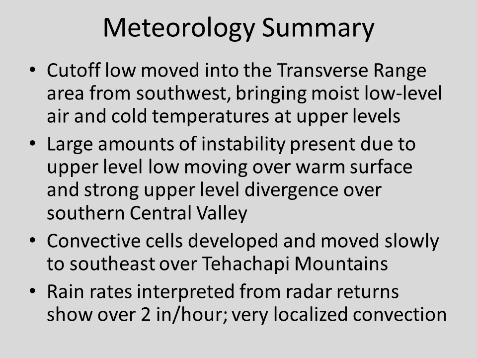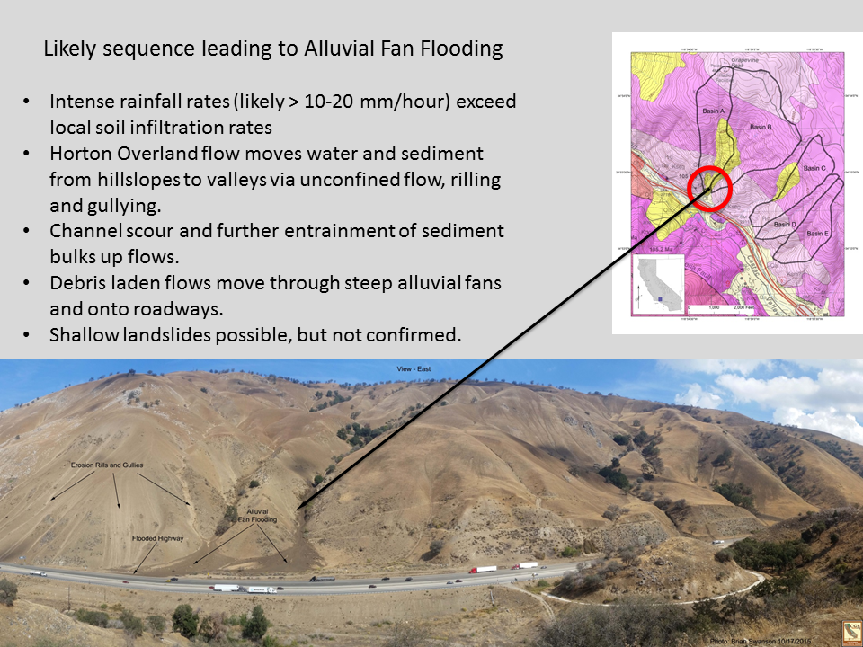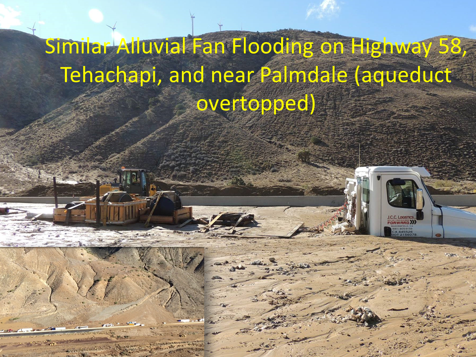Nina Oakley (WRCC/DRI), Jeremy Lancaster (CGS), John Stock (USGS), Brian Kawzenuk (CW3E), and Mike Kaplan (DRI) provide an analysis and synopsis of the meteorological and geological conditions that produced alluvial fan flooding over portions of Highway 58 and Interstate 5 in southern California. A weakening cutoff low that had entrained subtropical moisture moved onshore over southern California, initiating convection and localized heavy precipitation. Hillslope runoff concentrated in steep valleys where it entrained debris. The debris then flowed onto steep alluvial fans at the base of these valleys, inundating portions of I-5 and State Hwy 58.