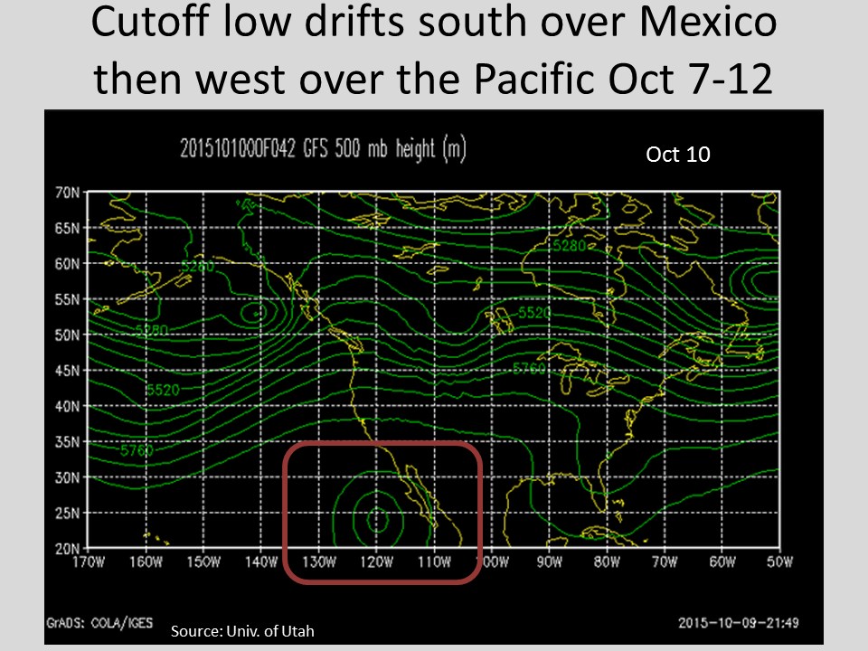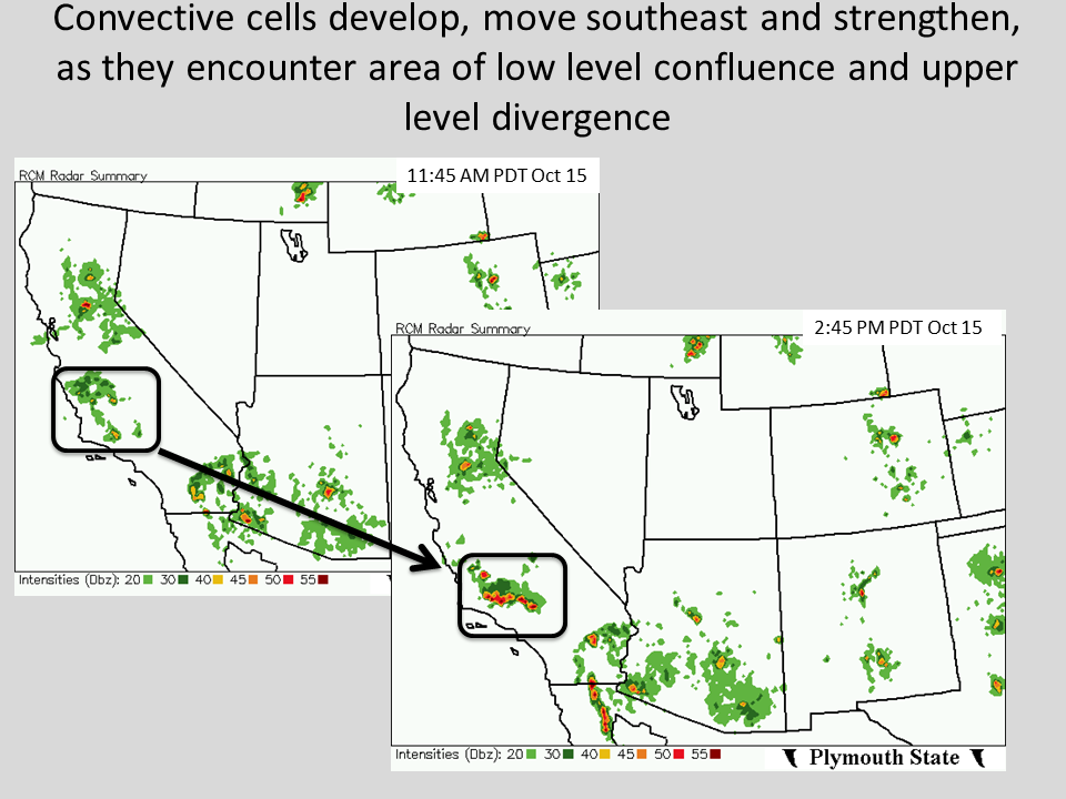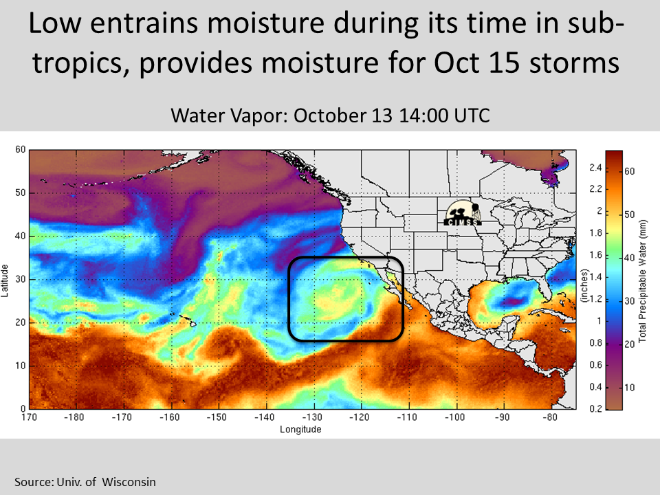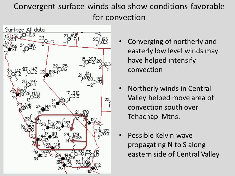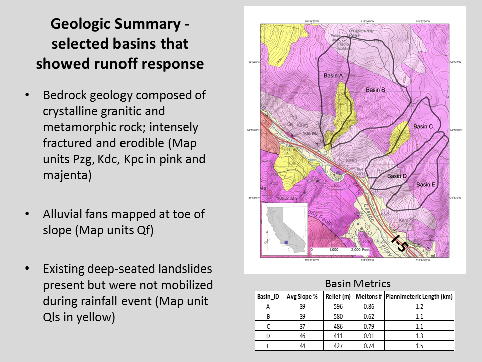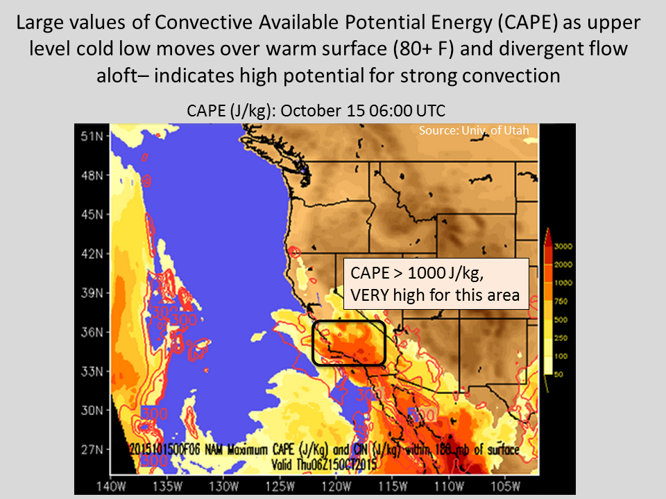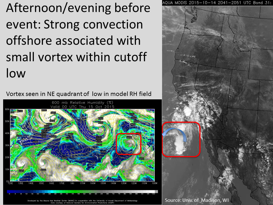Nina Oakley (WRCC/DRI), Jeremy Lancaster (CGS), John Stock (USGS), Brian Kawzenuk (CW3E), and Mike Kaplan (DRI) provide an analysis and synopsis of the meteorological and geological conditions that produced alluvial fan flooding over portions of Highway 58 and Interstate 5 in southern California. A weakening cutoff low that had entrained subtropical moisture moved onshore over southern California, initiating convection and localized heavy precipitation. Hillslope runoff concentrated in steep valleys where it entrained debris. The debris then flowed onto steep alluvial fans at the base of these valleys, inundating portions of I-5 and State Hwy 58.