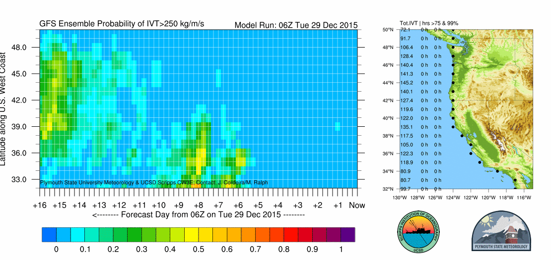 Above is a sequence of Jason Cordeira’s AR Landfall tool initialized between 0600 UTC 29 Dec 2015 and 0600 UTC 5 Jan 2016. The sequence shows how the forecast developed over the previous eight days and shows the skill this tool had in forecasting the AR. For more information on this product visit the AR Forecast page.