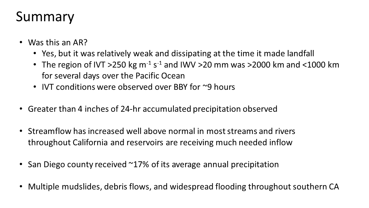 – AR conditions were not forecasted over southern CA until ~5 days in – advance