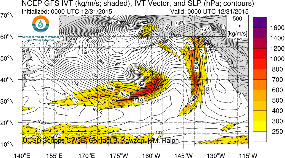 Above is a sequence of integrated vapor transport (IVT) from the GFS analysis during 31 December 2015 to 5 January 2016 which shows the Atmospheric River propagating towards California and making landfall.