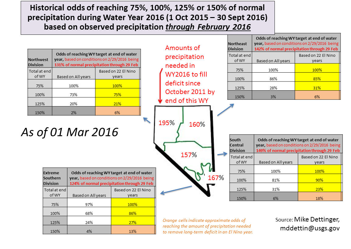 The Febraury 2016 precipitation observations are now in, and have allowed for an update to the calculation of the odds of reaching 100% of normal for the water year across three key climate divisions of California and Nevada. These odds have decreased slightly across all of California and Nevada as a result of a very dry February. The odds of reaching 100% of normal Water Year precipitation in the key northern California climate division that encompasses the Sacramento River, and the State’s largest water supply reservoirs, decreased from 52% as of the end of January 2016, to 38% as of the end of February 2016. A series of Atmospheric Rivers have made landfall over Northern California and produced heavy precipitation throughout early March and will most likely cause changes in these odds when updated at the end of March.