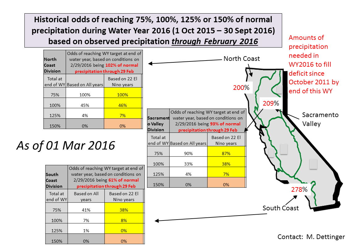 Odds of Reaching 100% of Normal Precipitation for Water Year 2016 in California (March update)