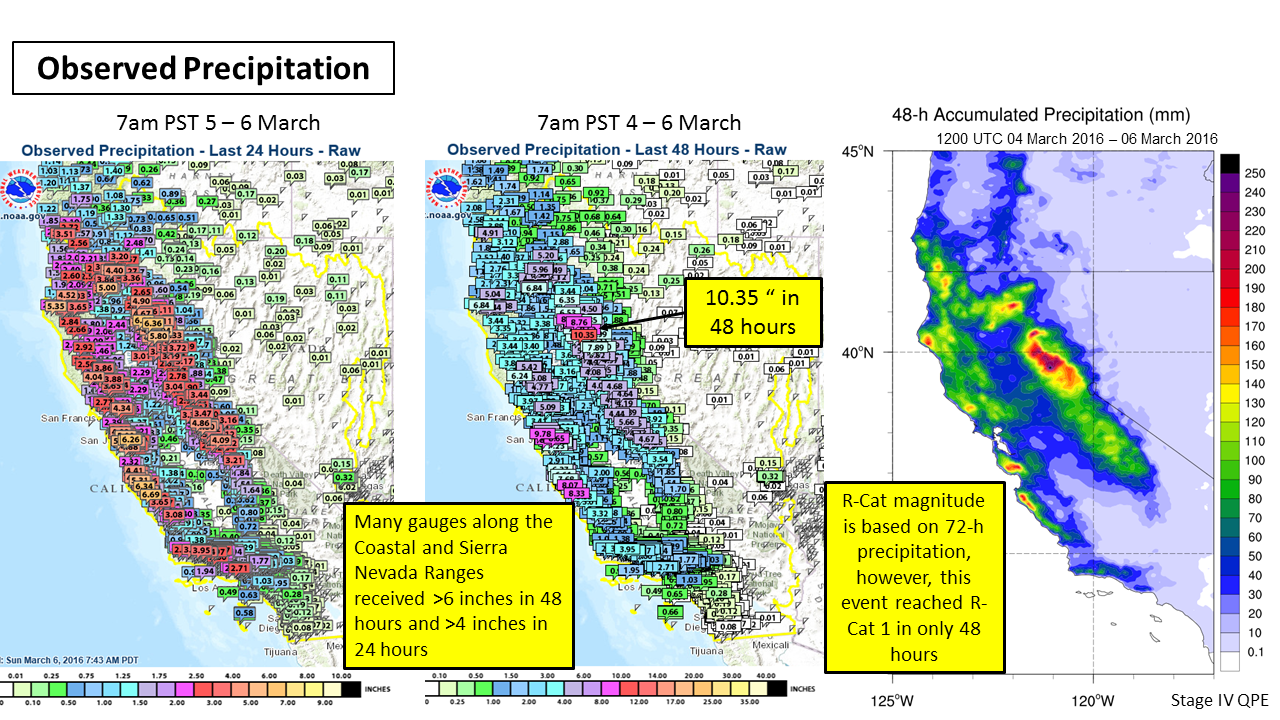 - Maximum 48-h precipitation of >10 inches occurred over the Sierra Nevada
