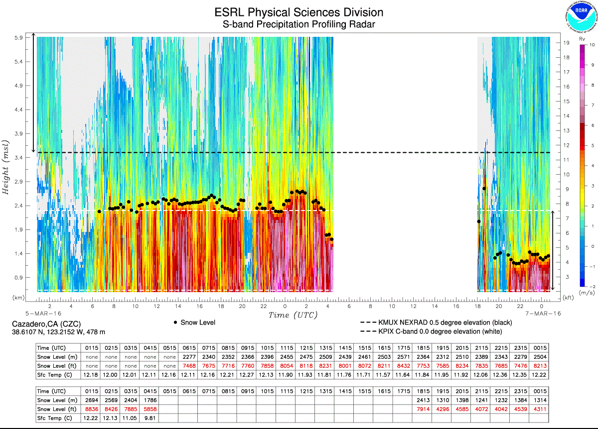 Heavy bright-band precipitation began ~0600 UTC 5 March Large drop in snow level post-frontal |
