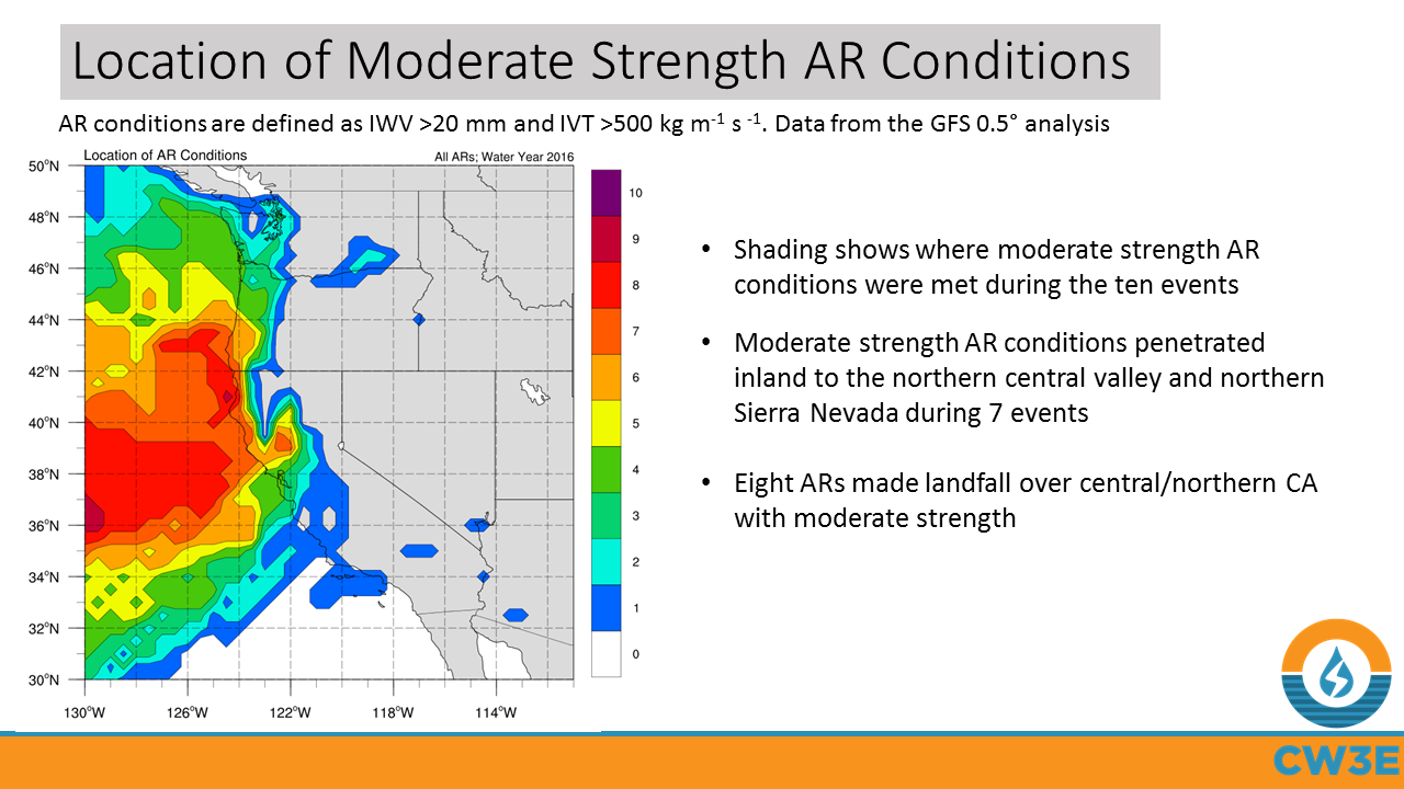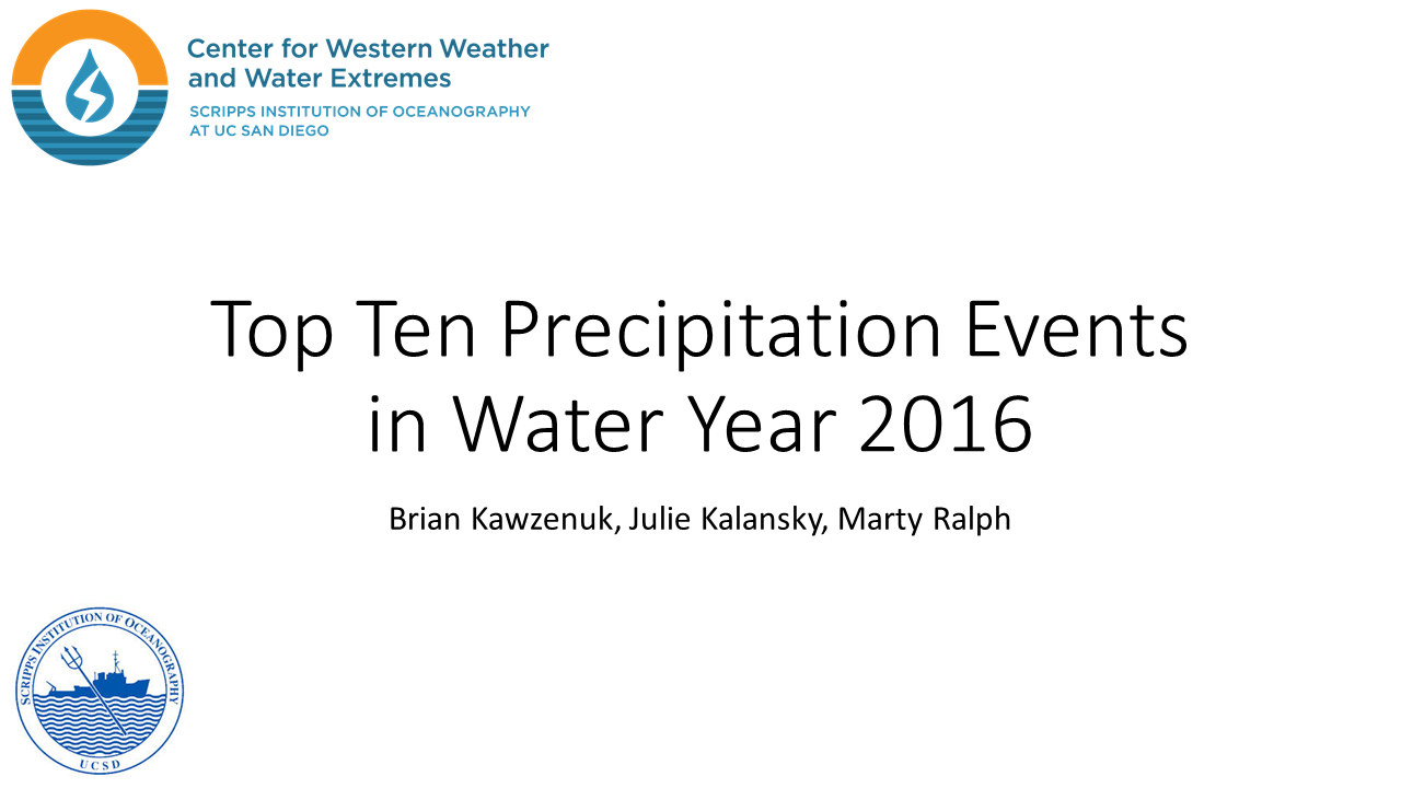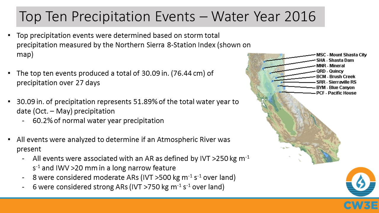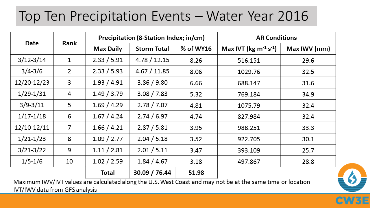 CW3E provides a summary of the top ten precipitation events based on the Northern Sierra 8-Station index during Water Year 2016 (Oct. 1 2015 – Sep. 30 2016). The top ten events occurred over a total of 27 days, and resulted in 30.09 inches of precipiation representing 51.89% of total water year precipitaiton and 60.2% of normal water year precipitation. All events were associated with an Atmospheric River (AR), with 6 considered strong ARs (IVT >750 kg m-1) s-1. For event specific reports refer to the CW3E News Page. For up to date AR forecasts and analysis visit the CW3E AR Portal.