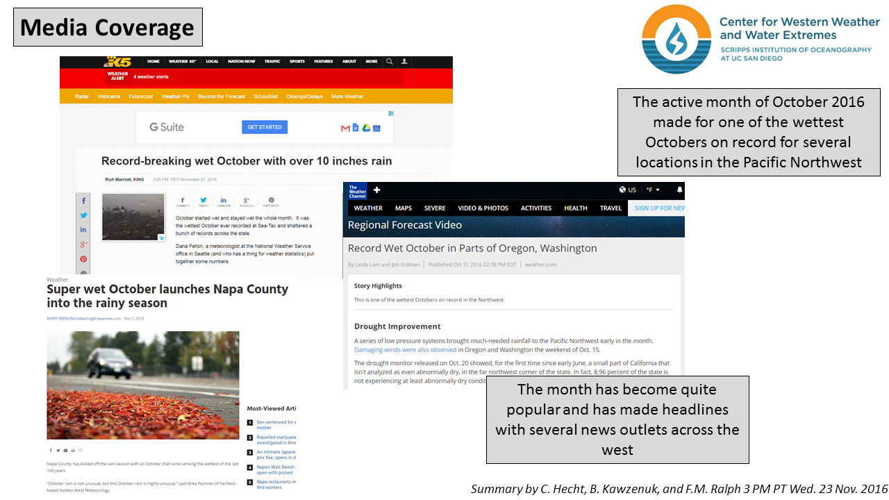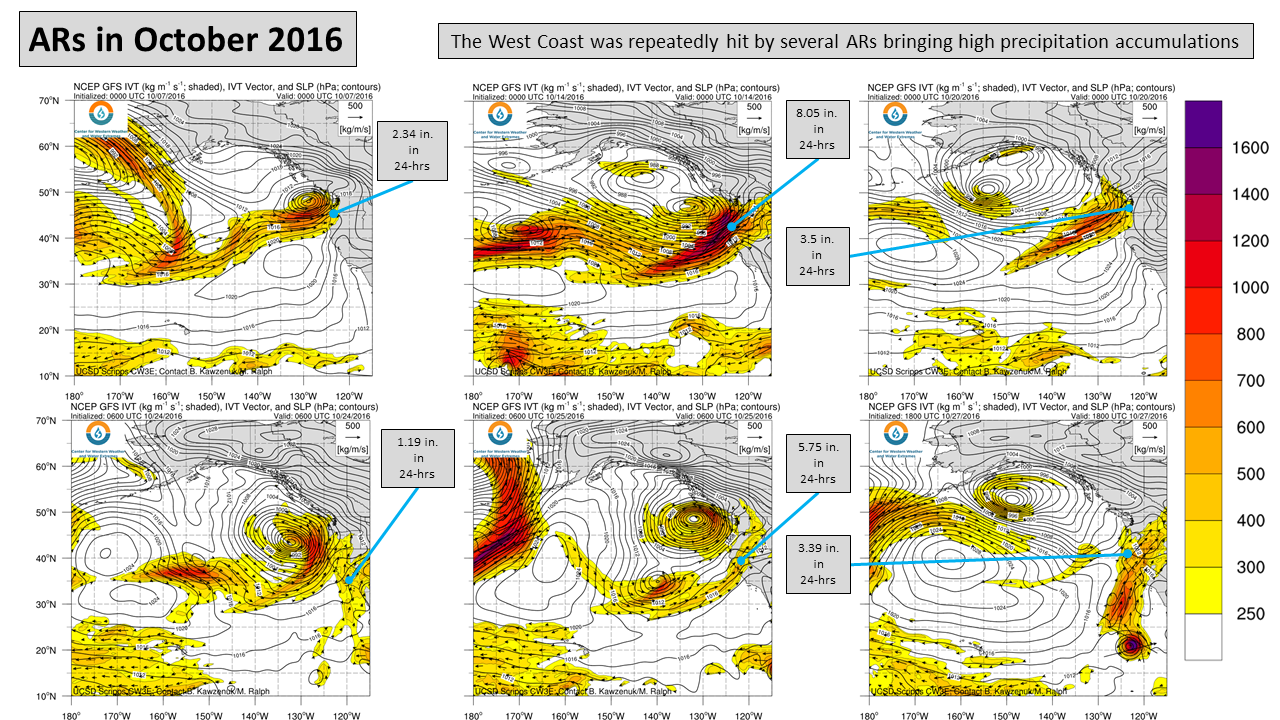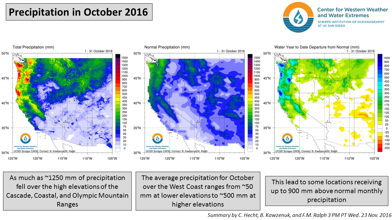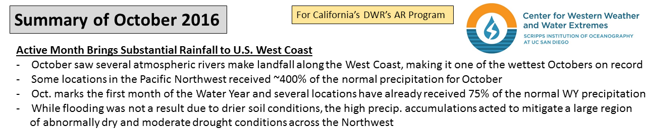 CW3E provides a summary of October 2016, one of the wettest Octobers on record for the Western United States. Several Atmospheric Rivers (ARs) made landfall along the U.S. West Coast and led to record setting precipitation production. For specific details on AR events refer to the CW3E AR Summaries, found on the CW3E News page.