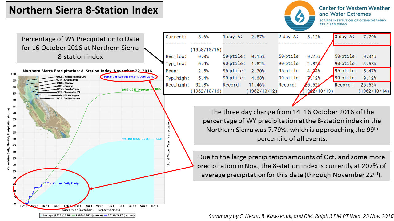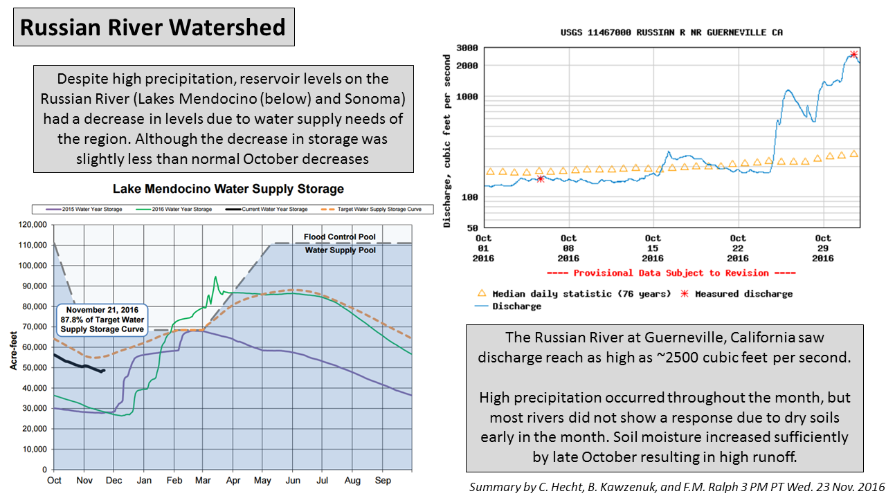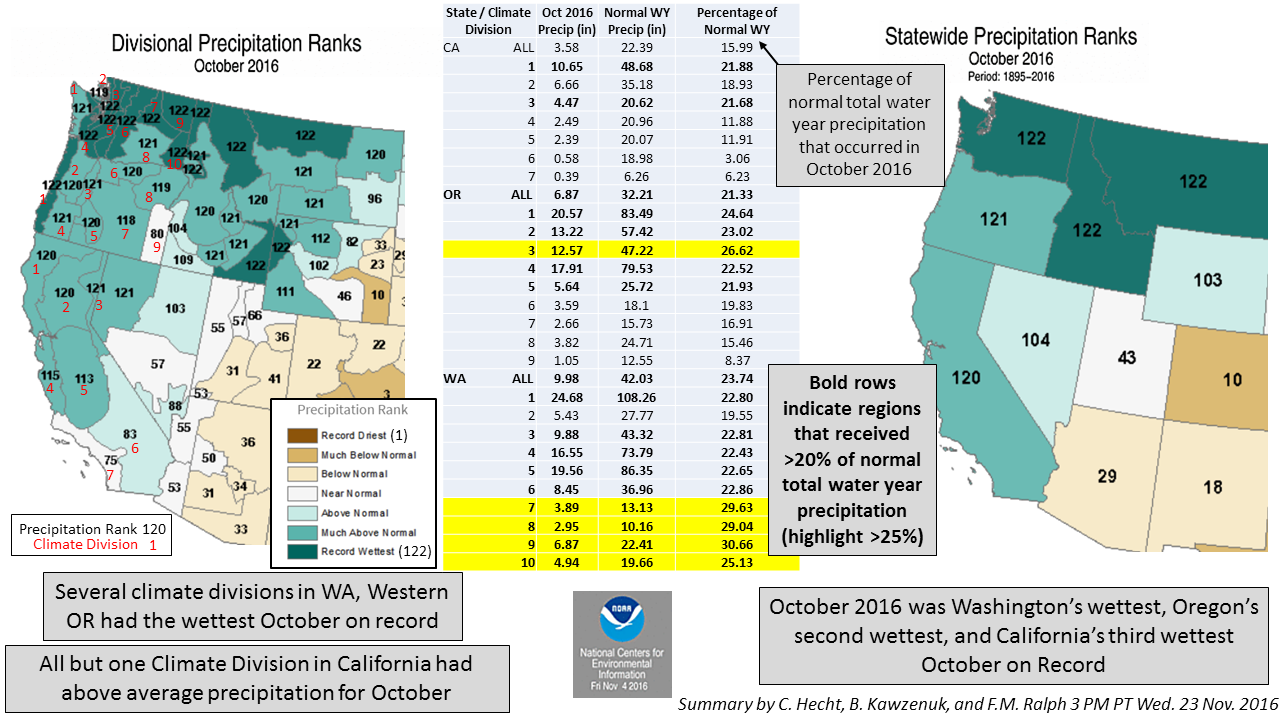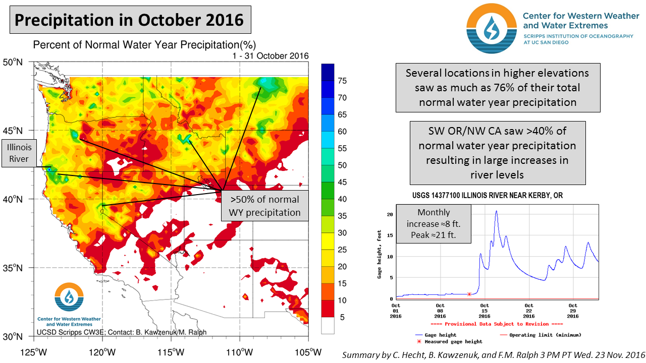 CW3E provides a summary of October 2016, one of the wettest Octobers on record for the Western United States. Several Atmospheric Rivers (ARs) made landfall along the U.S. West Coast and led to record setting precipitation production. For specific details on AR events refer to the CW3E AR Summaries, found on the CW3E News page.