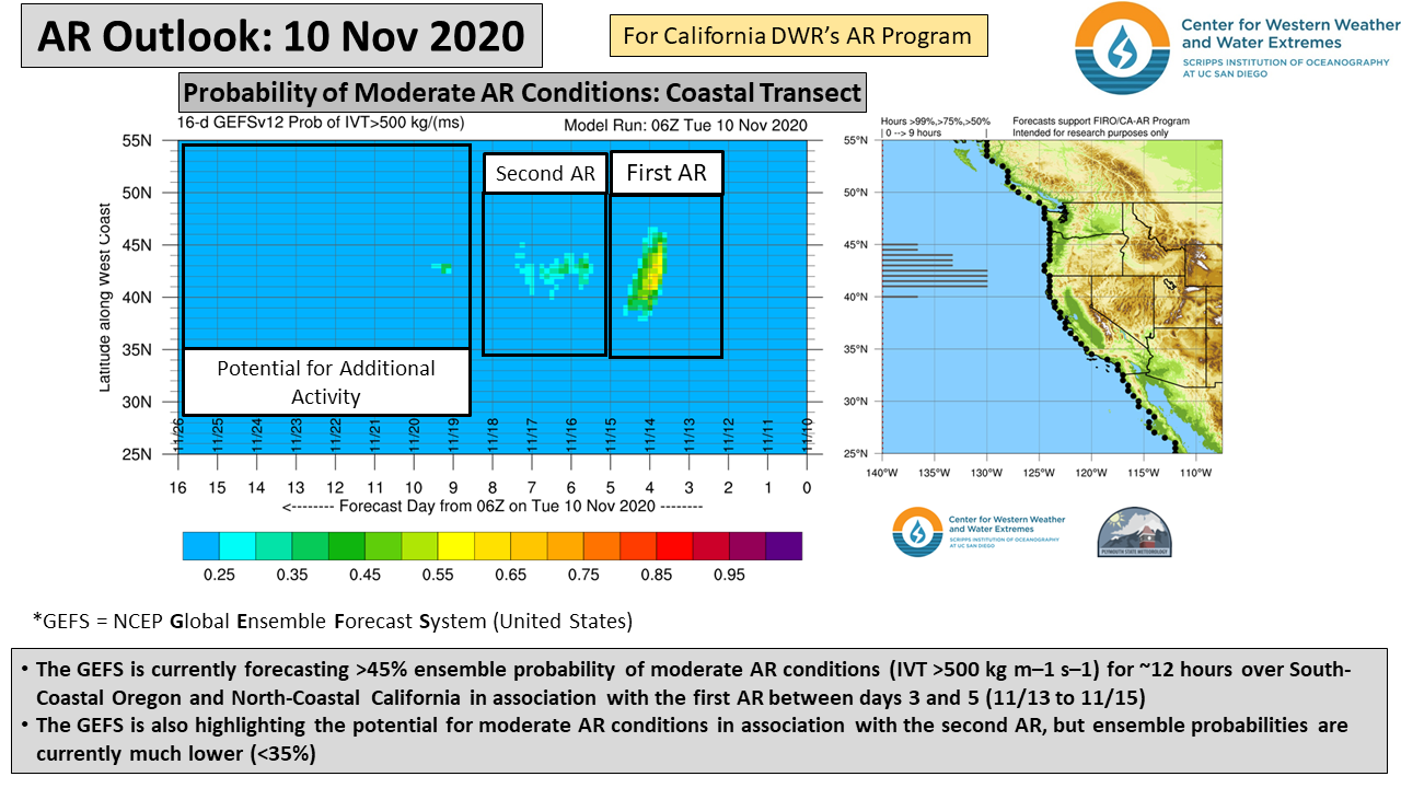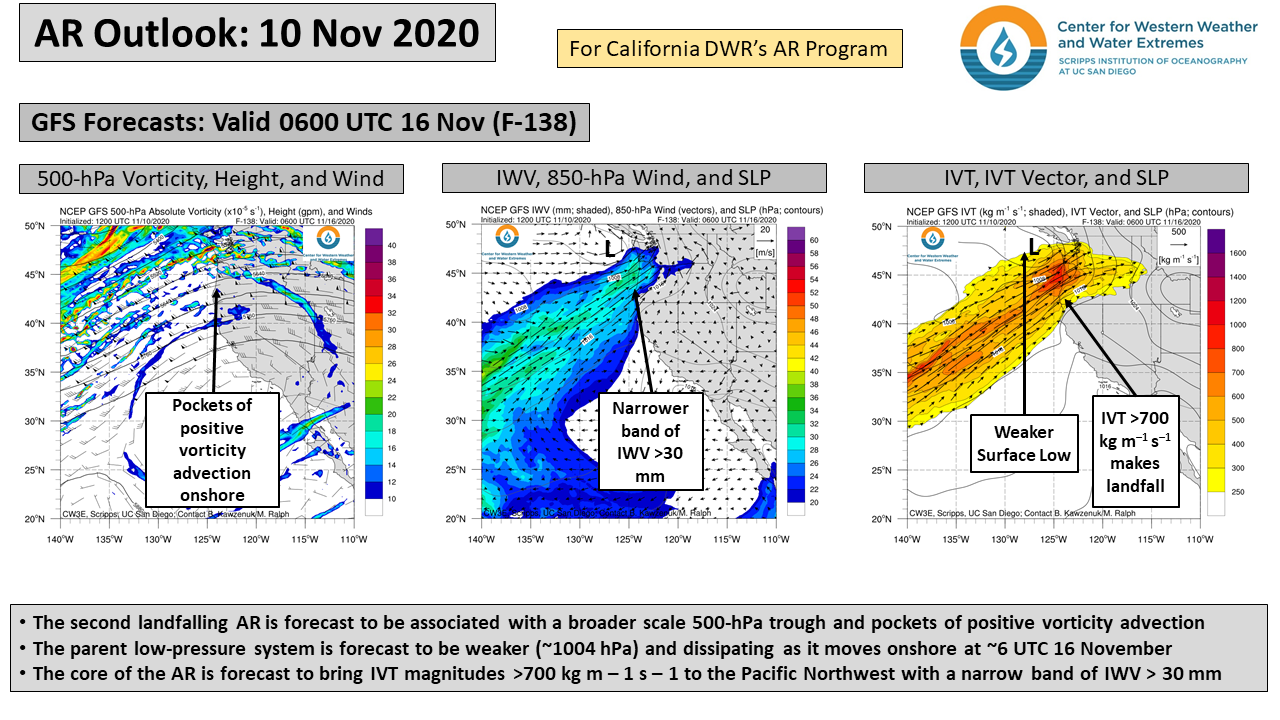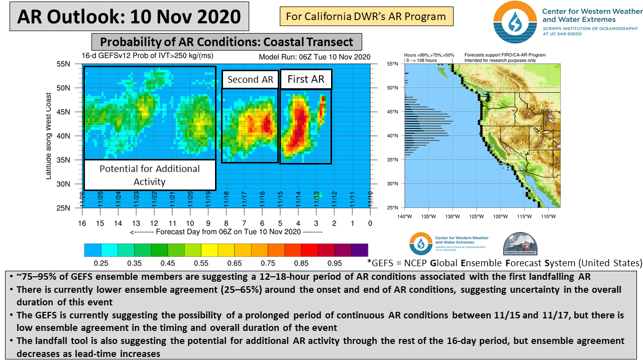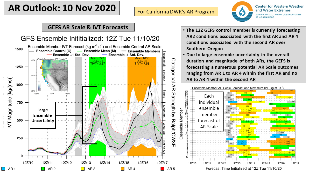 - The second AR is forecast to make landfall over the Pacific Northwest on 15 November but is also associated with large ensemble and model-to-model uncertainty