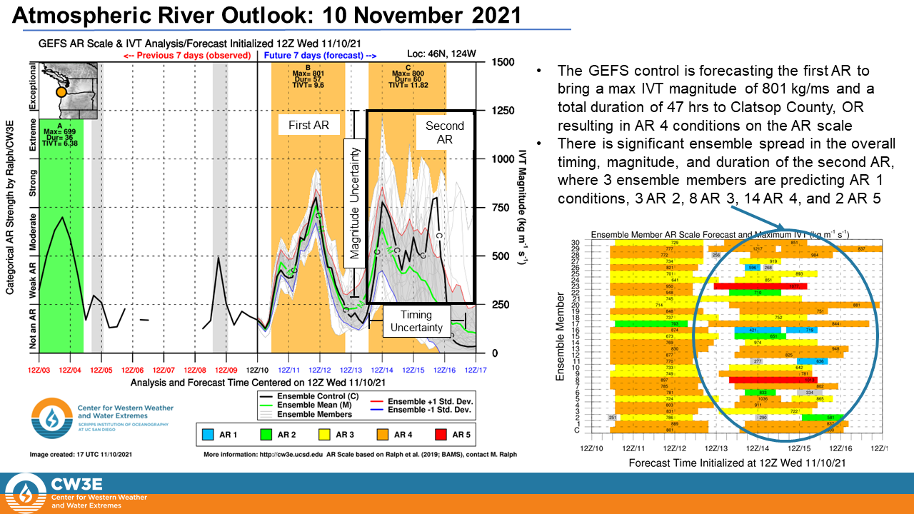 - There is currently large model uncertainty pertaining to the timing, maximum intensity, and overall duration of the second AR, though several GEFS ensemble members are predicting AR 4 conditions for South-Coastal Washington