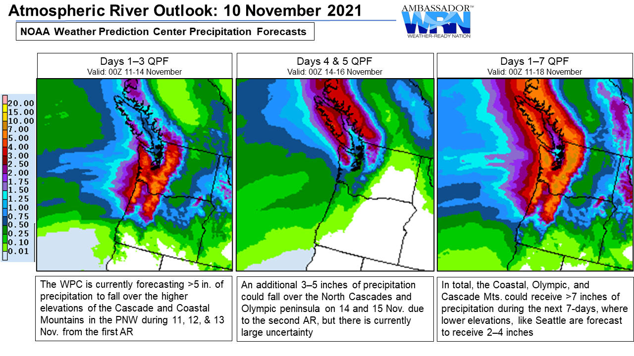 - Current precipitation forecasts indicate that this first AR could bring more than 5 inches of precipitation to the Cascade, Olympic, and Coastal Mountains in Oregon and Washington