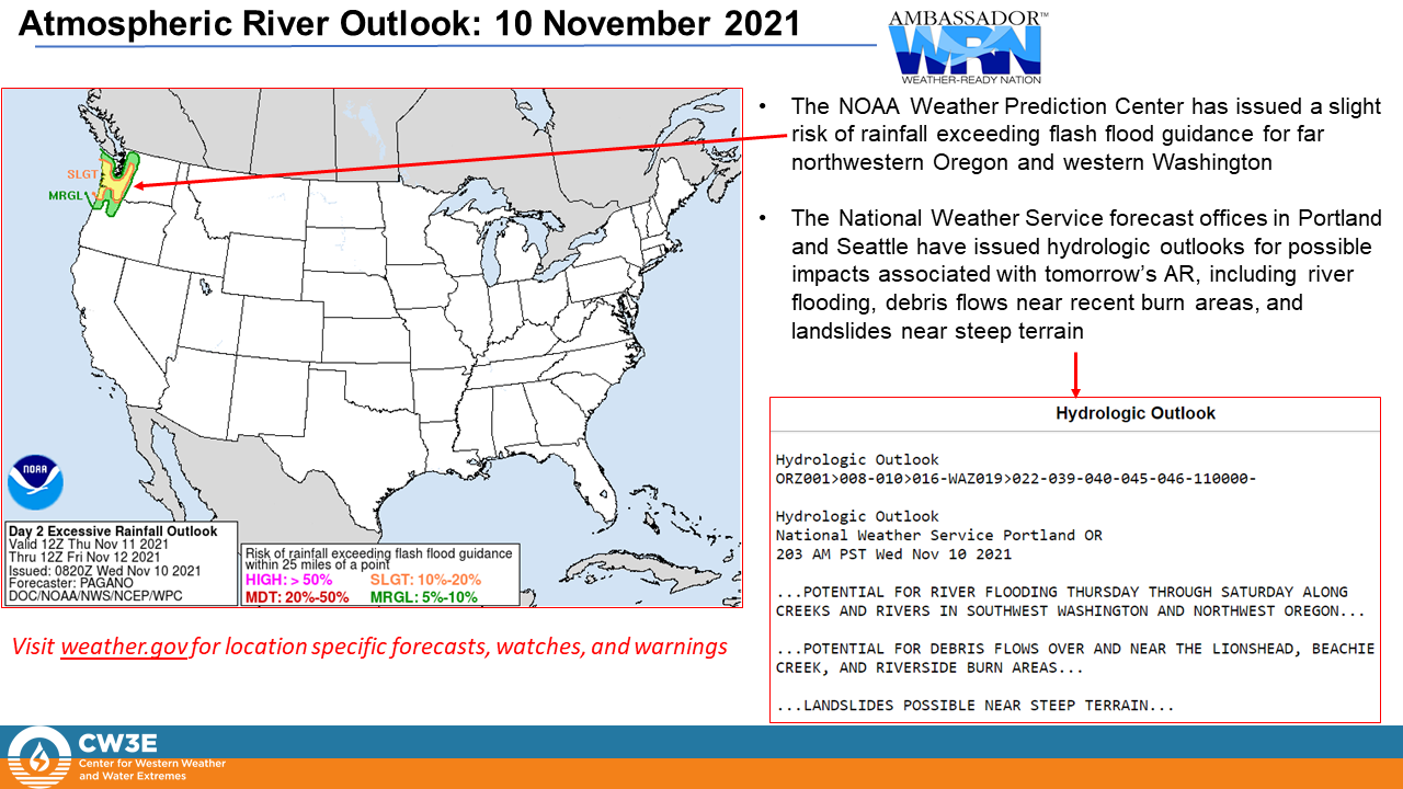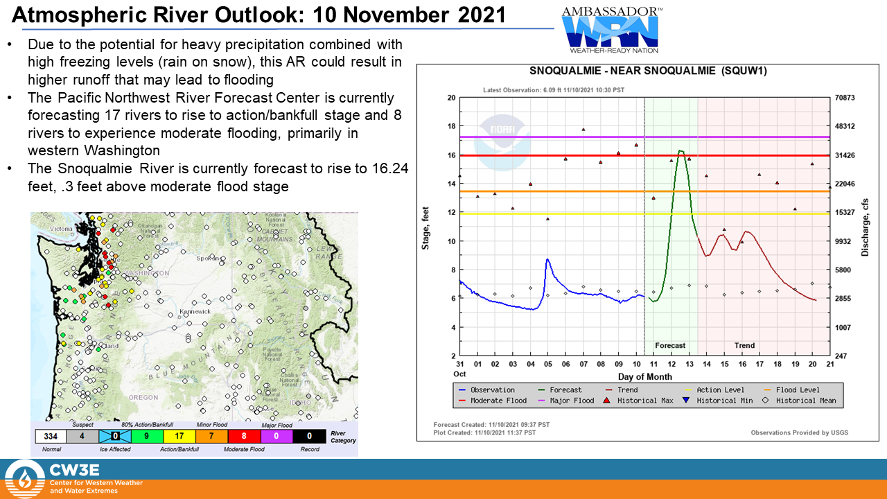- The first AR is forecast to make landfall over coastal Washington tomorrow, bringing AR 4 conditions to much of the Coast