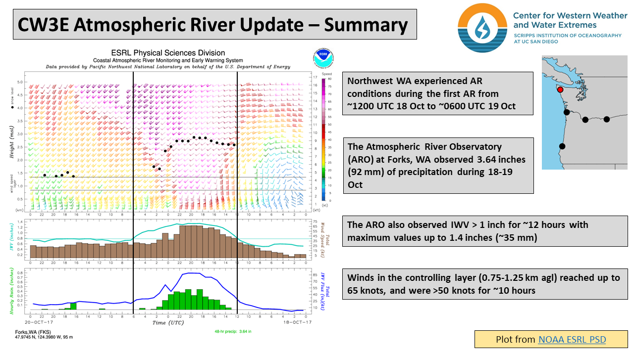 - The first AR made landfall over WA and OR ~1200 UTC 18 October 2017