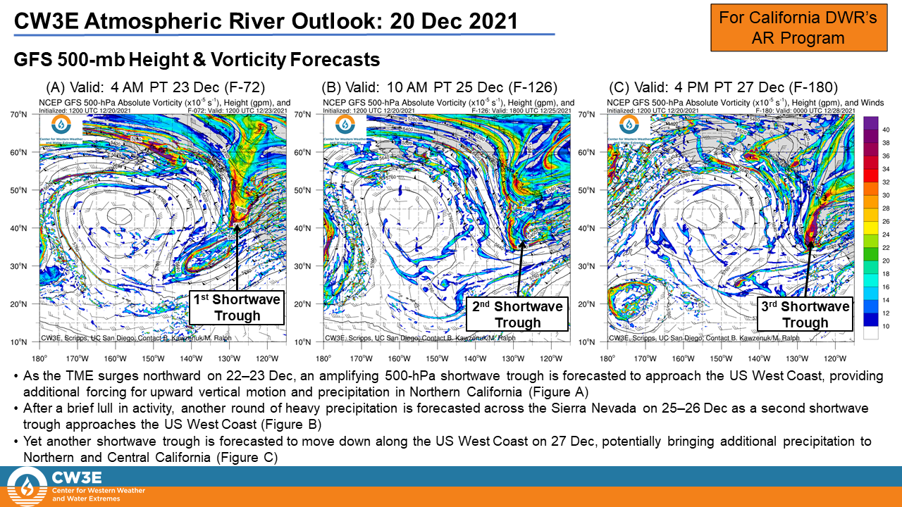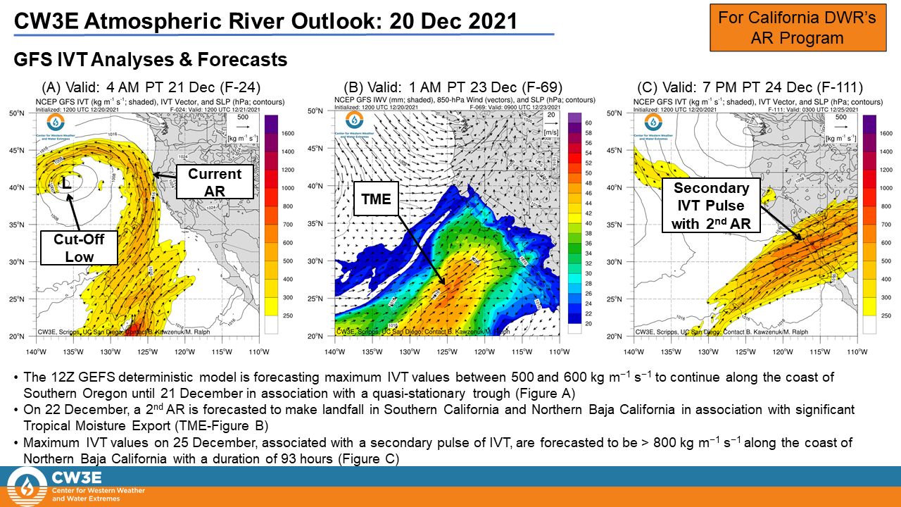 Click images to see loops of GFS IVT & 500-hPa vorticity forecasts Valid 1200 UTC 20 December – 0000 UTC 28 December 2021 |