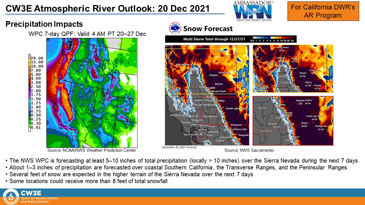 - Over the next seven days, the NWS Weather Prediction Center (WPC) is forecasting 5–10 inches of total precipitation (locally > 10 inches) over the Sierra Nevada and 1–3 inches of total precipitation over coastal Southern California, the Transverse Ranges, and the Peninsular Ranges