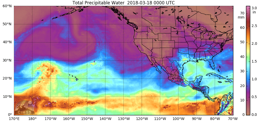 Click IVT or IWV image to see loop of 0-72 hour GFS forecast Valid 1200 UTC 20 March – 1200 UTC 23 March 2018 |