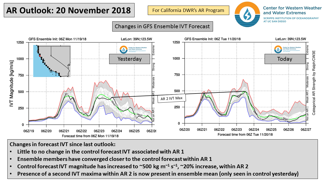 - Forecast confidence within the GEFS has continued to increase for the two ARs forecast to impact CA over next few days