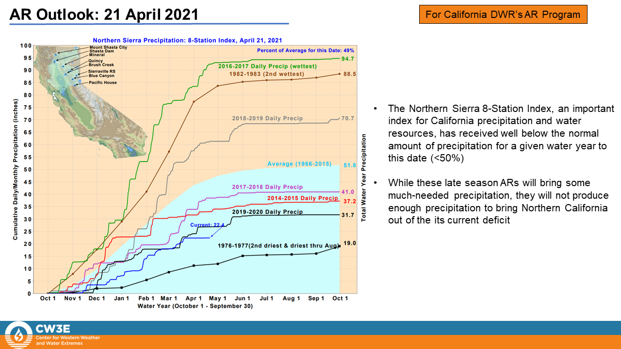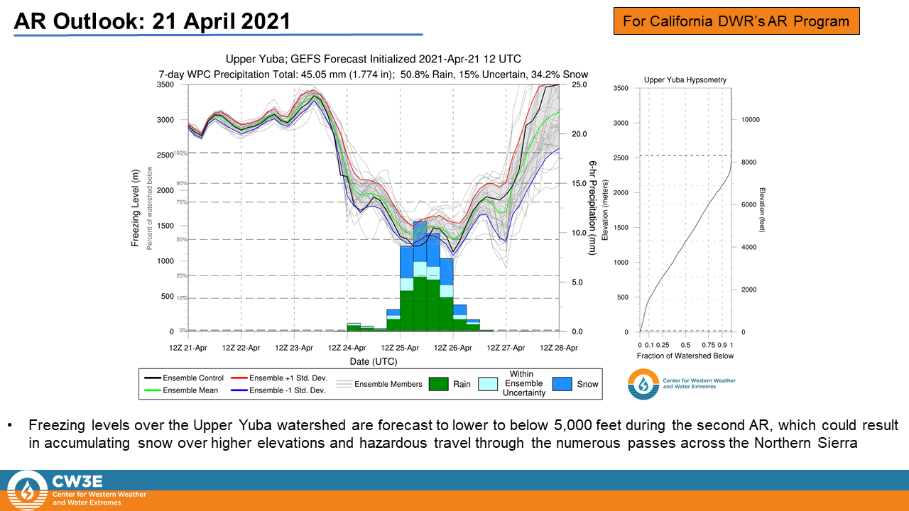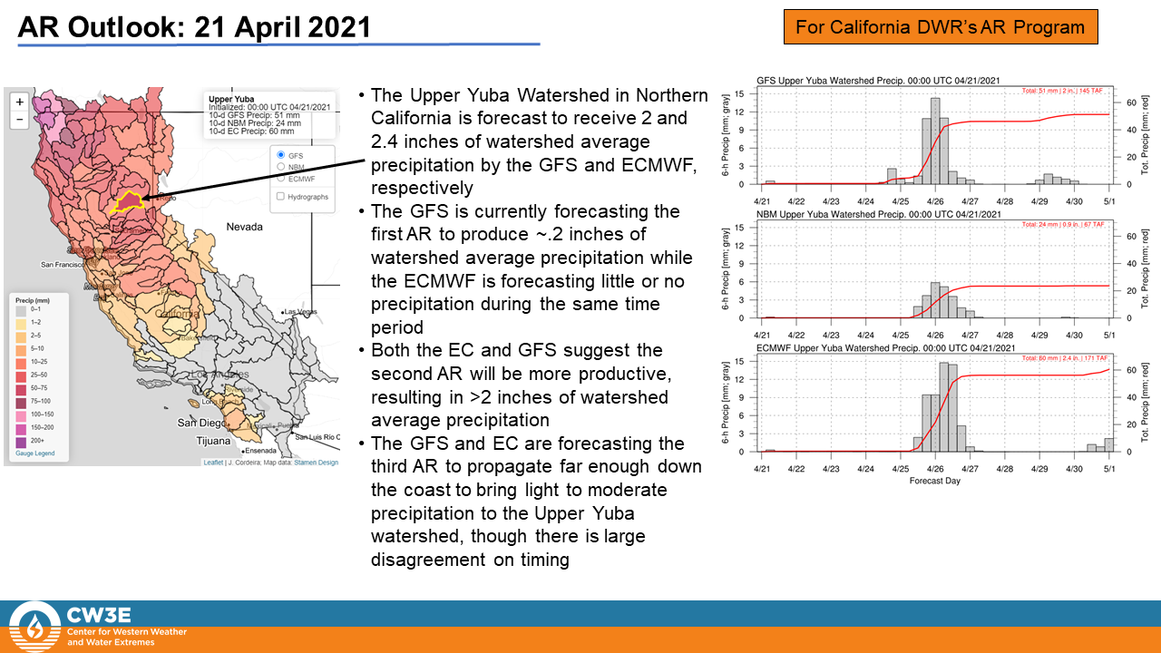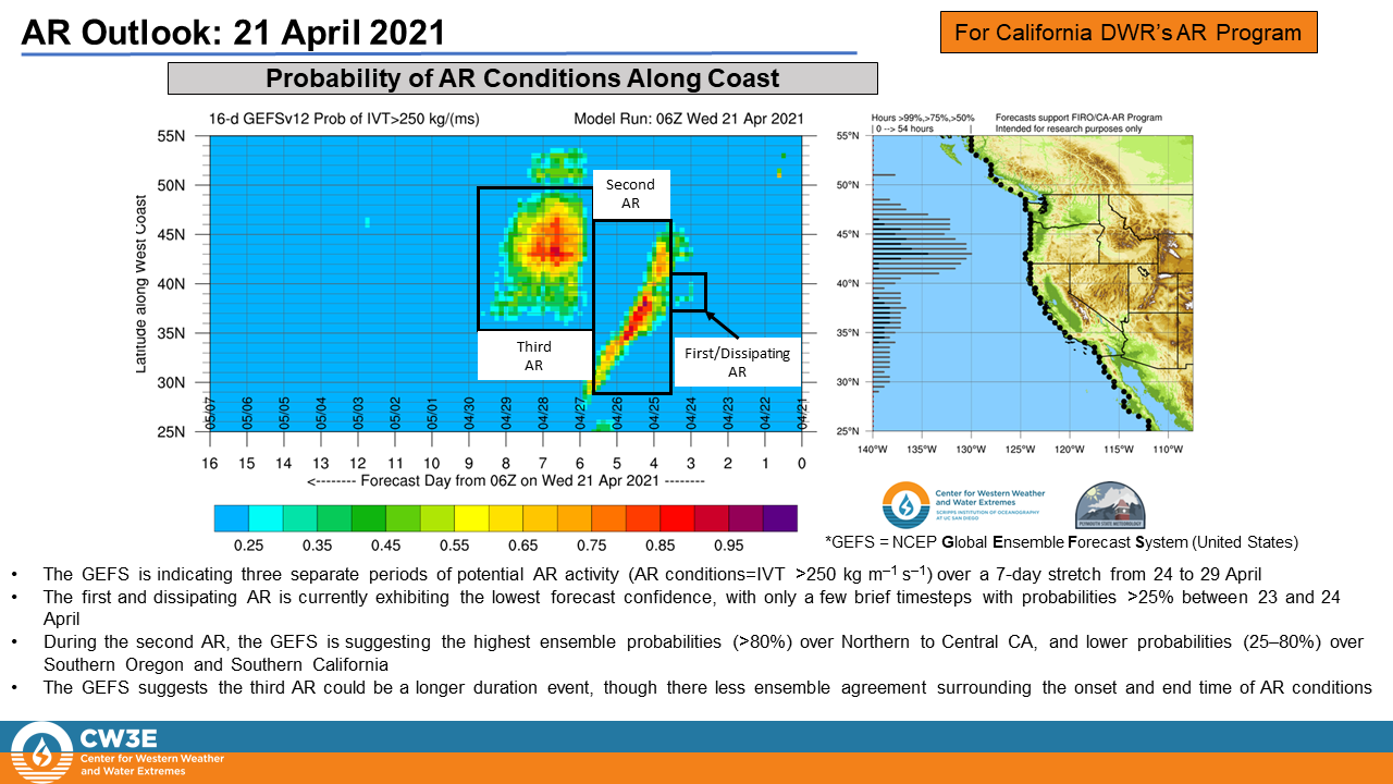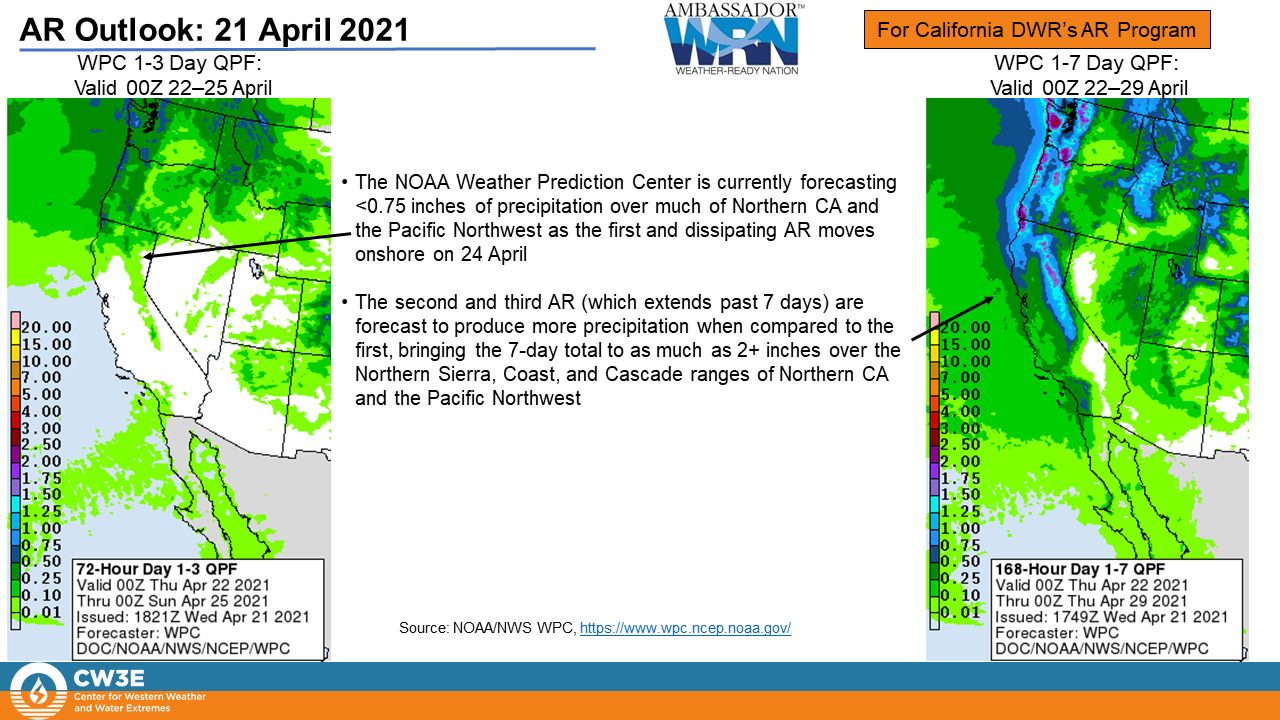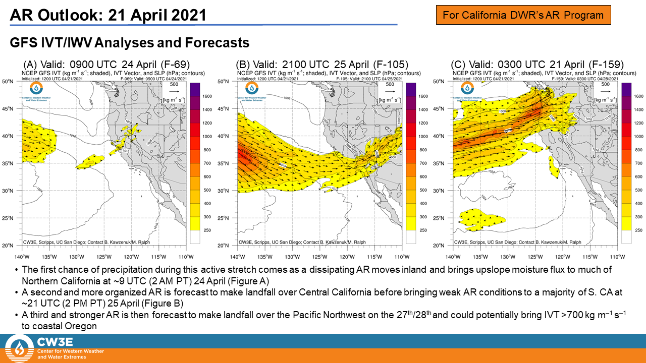 - The first and weakest AR is forecast to bring dissipating, disorganized, and brief AR conditions to Northern California on 24 April, resulting in <1 inch for much of the Northern CA mountains