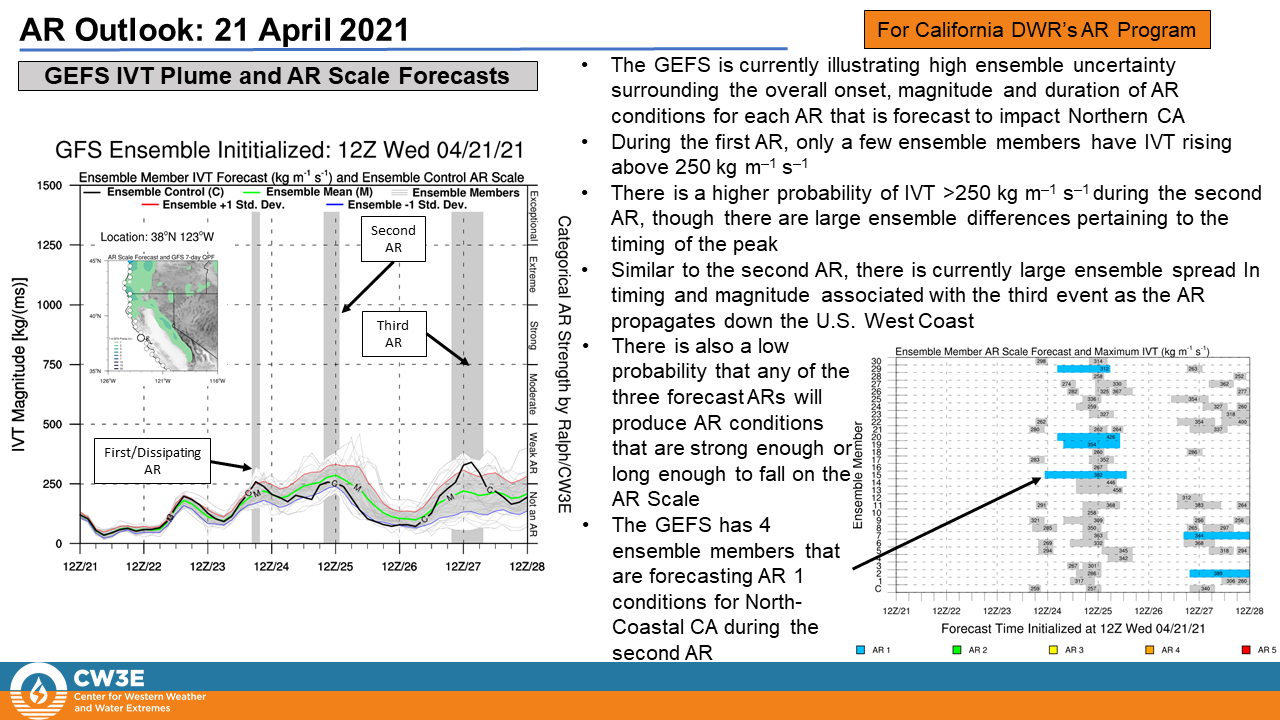 - The third AR is forecast to make landfall over the Pacific Northwest on April 28th and could bring IVT magnitudes >700 kg m–1 s–1 to coastal Oregon, though ensemble uncertainty is currently high