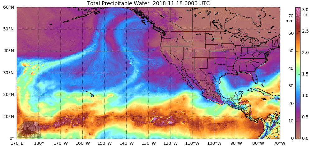 Click IVT or IWV image to see loop of 0-240 hour GFS forecast Valid 1200 UTC 21 November – 1200 UTC 26 November 2018 |