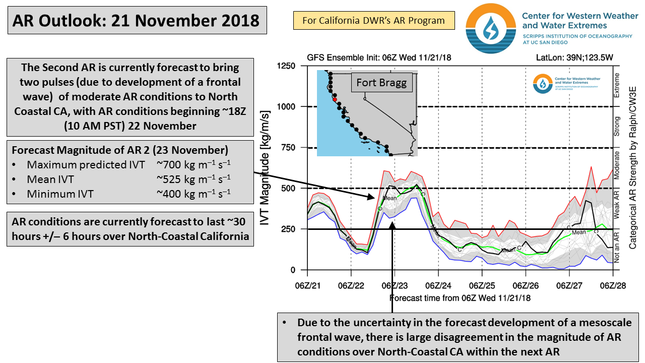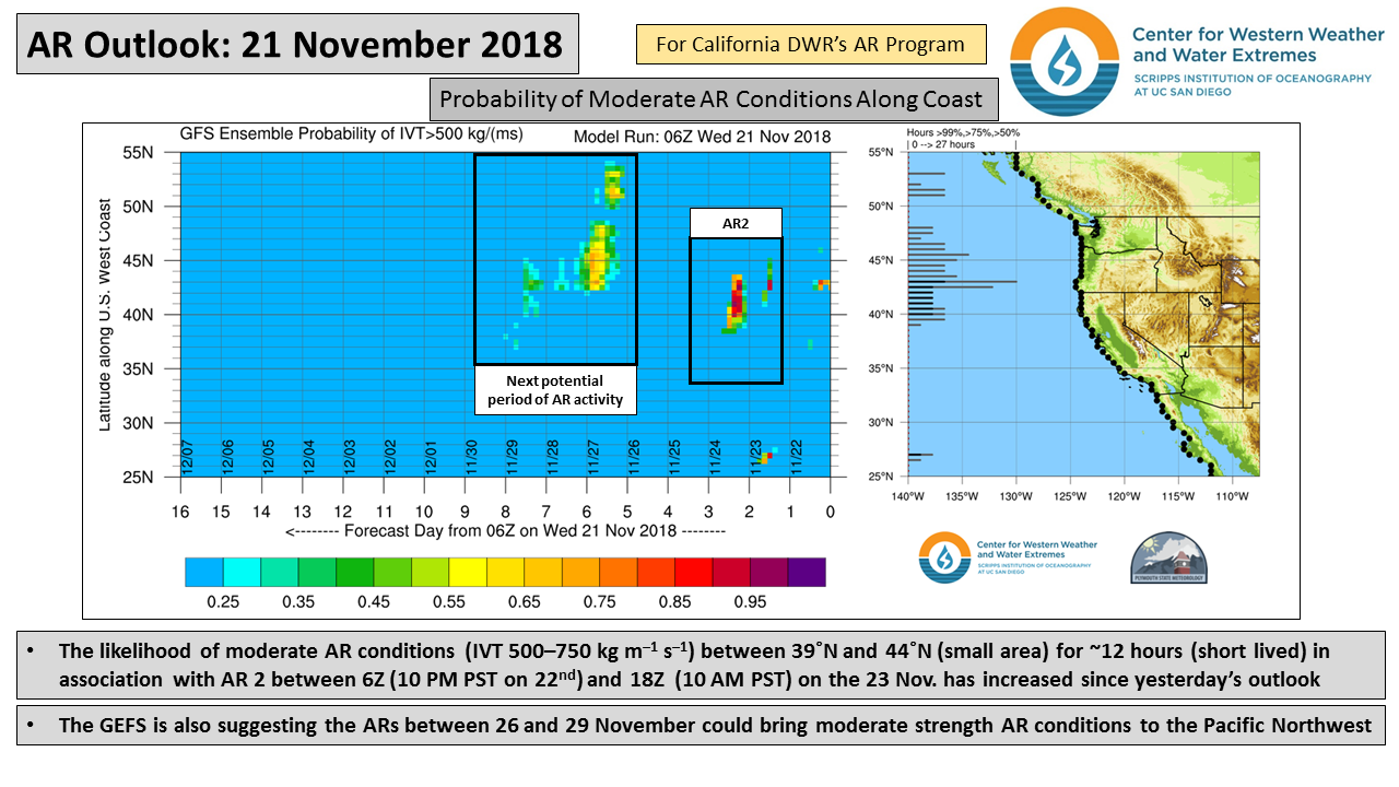 - AR conditions associated with AR 2 are forecast to end at ~6 UTC 24 November (11 PM PST 23 November) over Central CA
