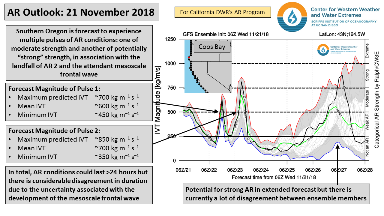 - AR 2 is forecast to bring strong AR conditions (IVT 750–1000 kg m–1 s–1) to Southern OR and moderate AR conditions to CA tomorrow