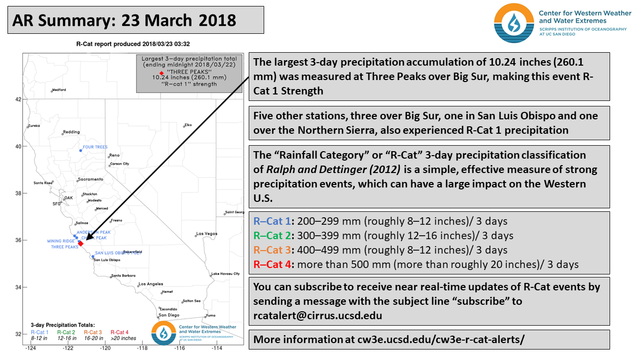 - This was an R-Cat 1 event as over 200 mm of precipitation was observed just south of Big Sur and over the northern Sierra Nevada over 72 hours