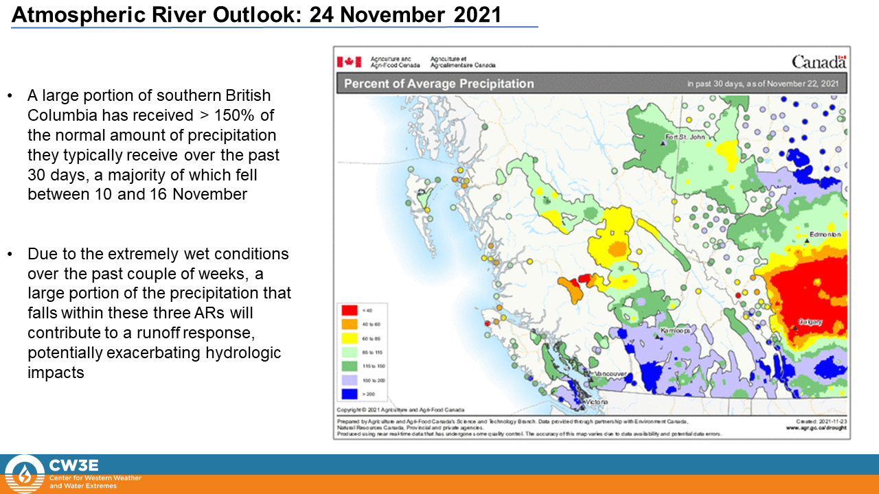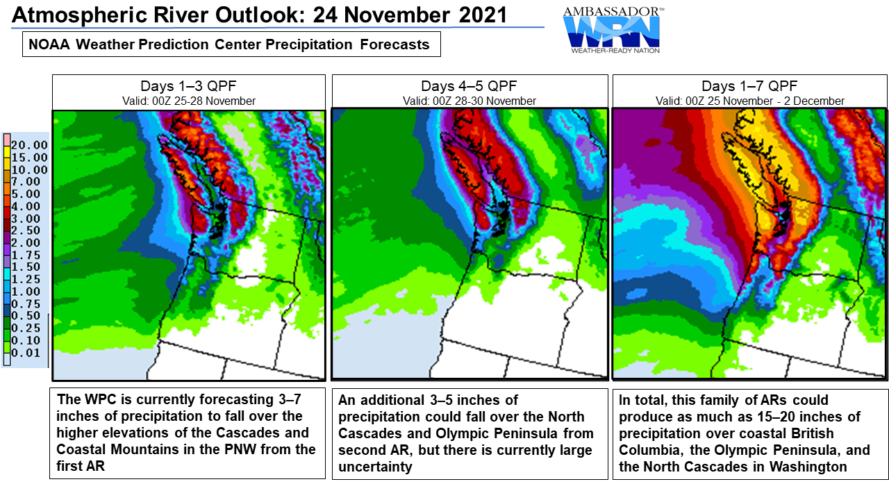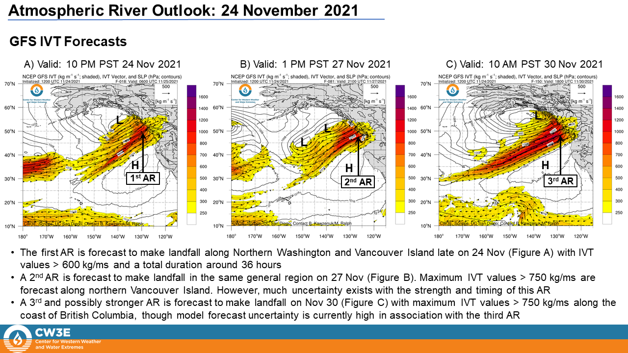 - Three atmospheric rivers (ARs) are forecast to bring enhanced precipitation to much of the PNW and BC over the next week after a family of ARs brought record-breaking rains and flooding to the region during 10–16 November