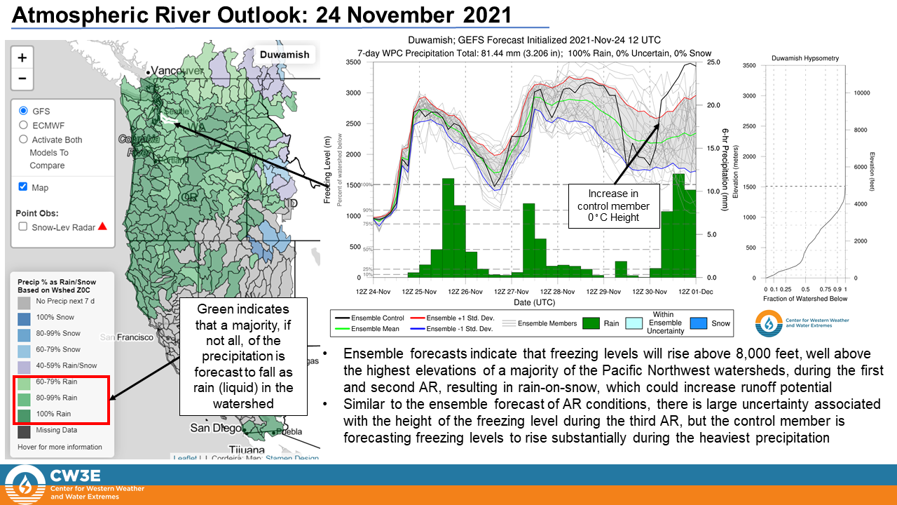 - Due to high forecasted freezing levels and moist soil conditions caused by the multiple ARs during 10–16 November, a large portion of the precipitation could lead to runoff, exacerbating hydrologic impacts