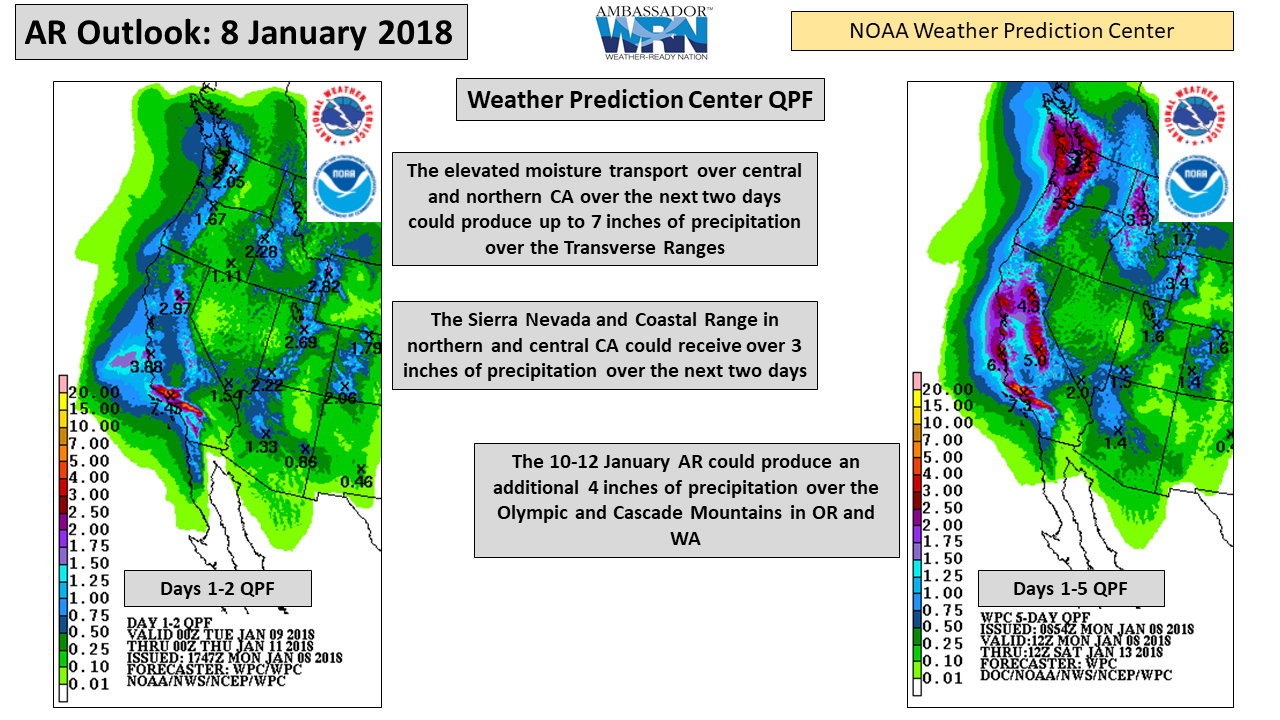 - An AR is expected to make landfall over the Pacific Northwest on 10 January 2018 and could produce up to 6 inches of precipitation over the Cascade Mountains
