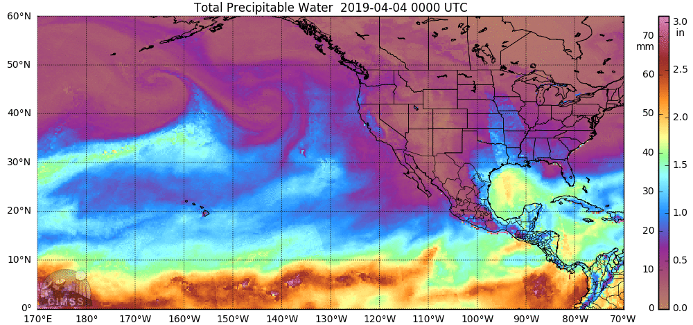 Click IVT or IWV image to see loop of GFS Analysis Valid 0000 UTC 5 April – 0600 UTC 9 April 2019 |