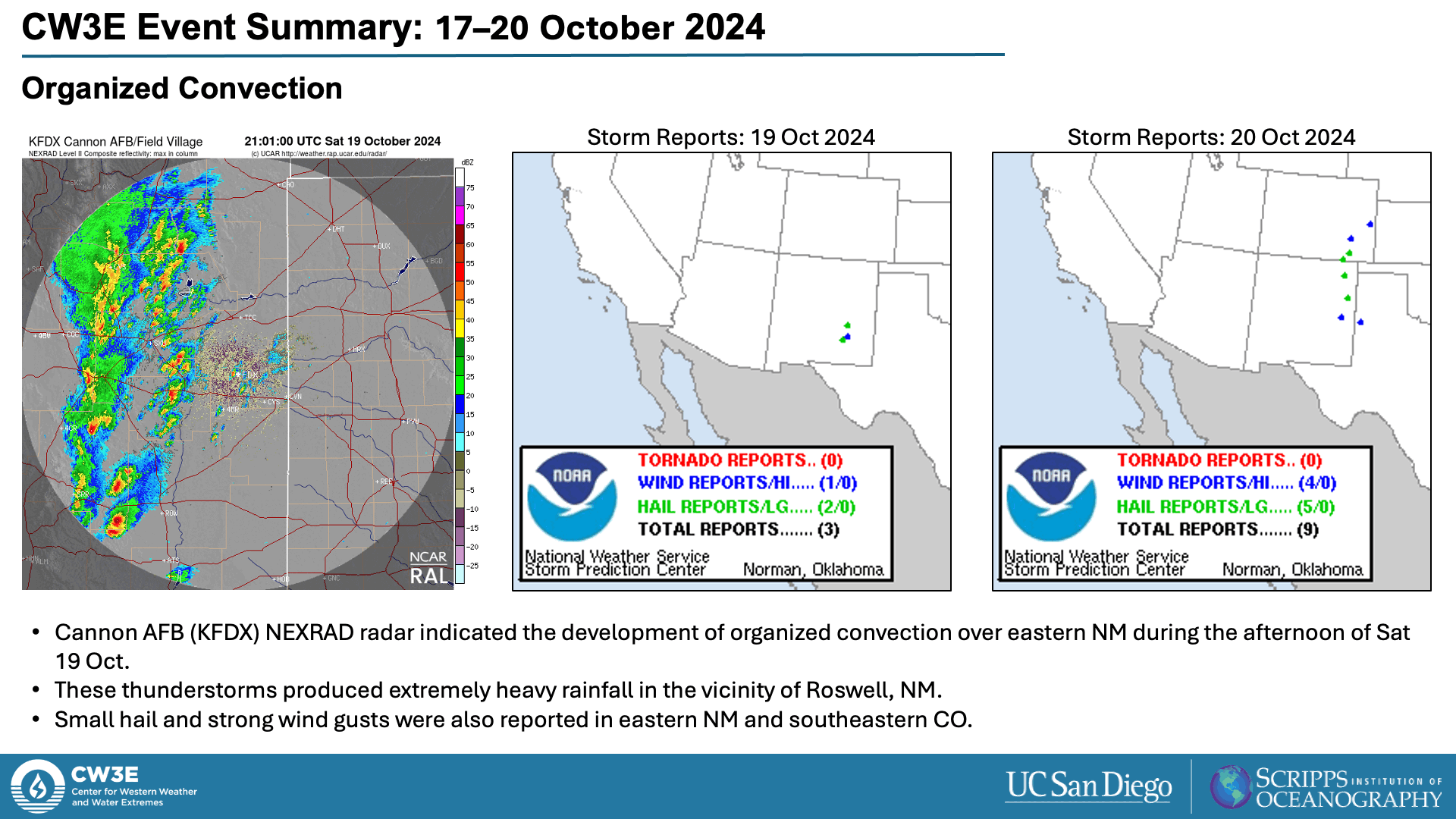 • The combination of strong synoptic-scale forcing, large instability, ample moisture, and strong vertical wind shear created favorable conditions for the development of organized convection over eastern NM on Sat 19 Oct.
