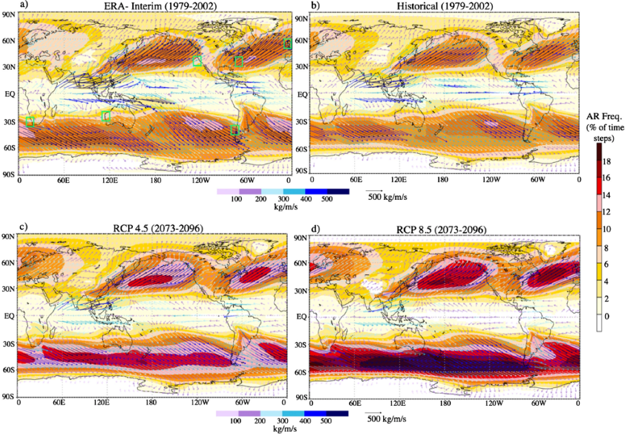 Figure 2 from Espinoza et al., 2018. AR frequency (shading; percent of time steps) and IVT (vectors; kg · m−1 · s−1) for (a) ERA‐Interim reanalysis for the historical period (1979–2002) with six green boxes depicting regions analyzed in Figures S2 and S3, (b) the MMM for the 21 CMIP5 models analyzed in this study for the historical period (1979–2002), (c) RCP4.5 warming scenario (2073–2096), and (d) RCP8.5 warming scenario (2073–2096).
