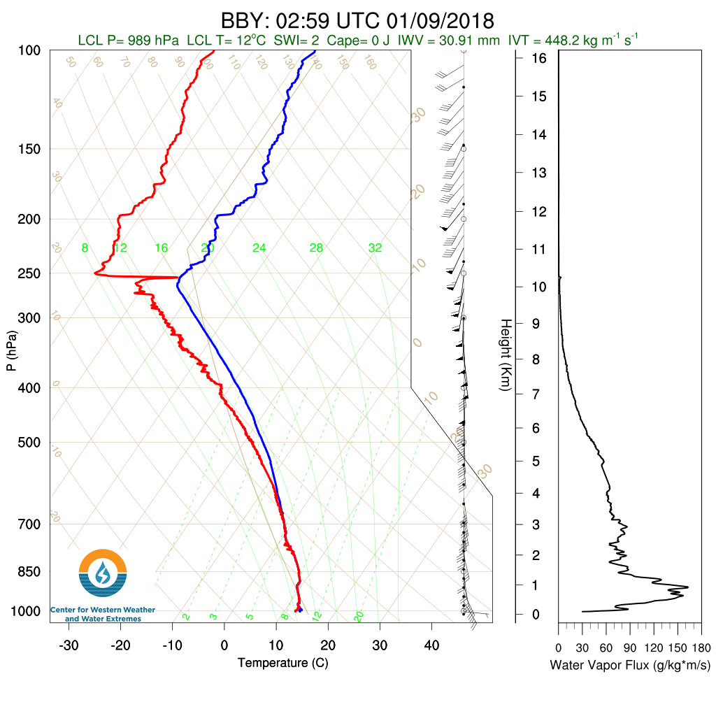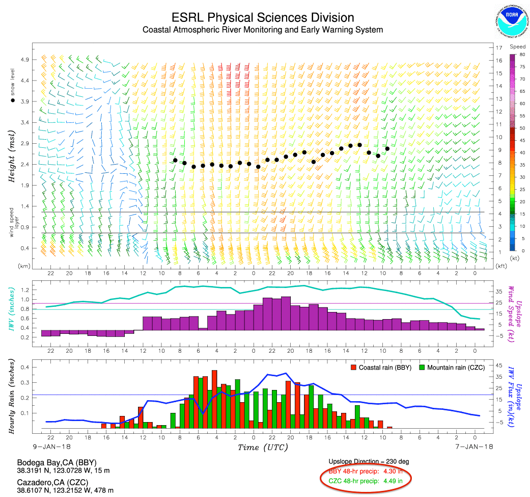 The team is launching from two sites: a coastal site, the UC Davis Bodega Bay Marine Laboratory and an inland site in Ukiah, CA, southwest of Lake Mendocino. These launches are being shared with National Weather Service Weather Forecast Offices in Eureka, Sacramento, and Monterey. Peak launches recorded 511 units integrated water vapor transport (IVT) at Bodega Bay (0000Z 9 January 2018) and 389 units IVT at Ukiah (2100Z 8 January 2018).