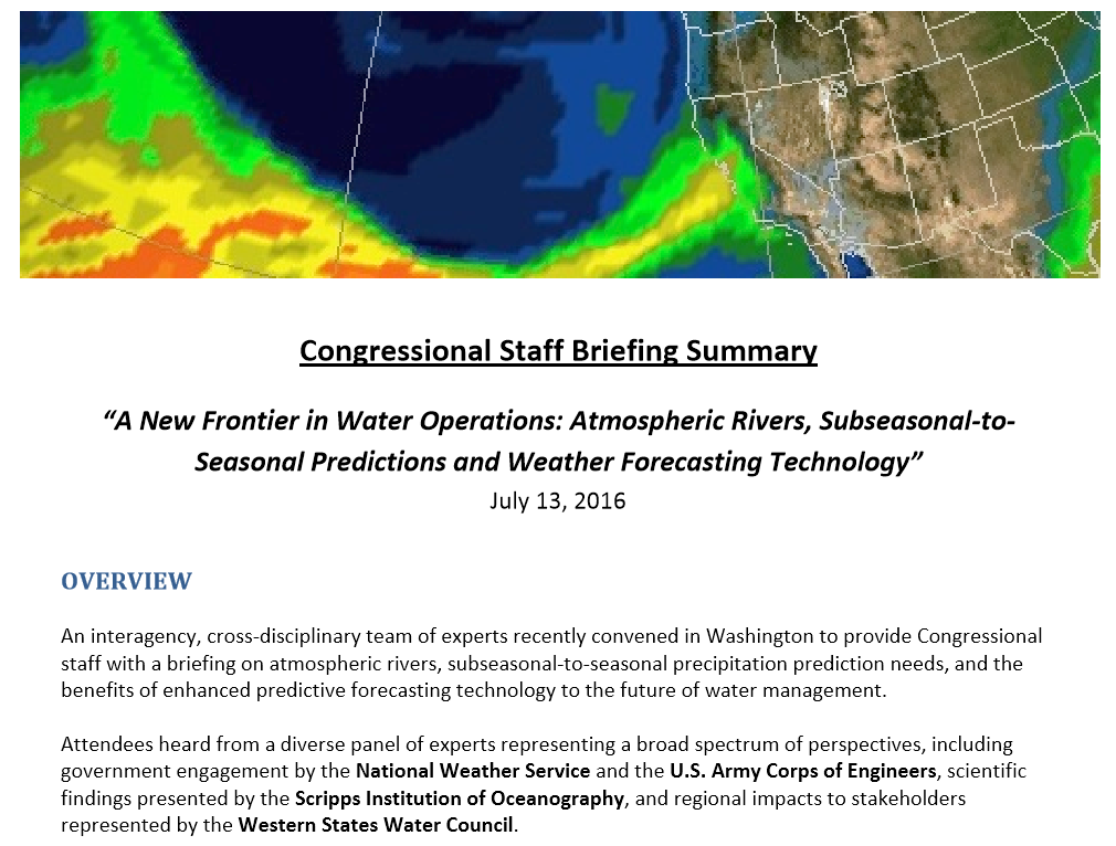 FIRO is being developed and tested as a collaborative effort in the Russian River Basin (Lake Mendocino, Lake Sonoma), the Santa Ana River Basin (Prado Dam, Seven Oaks Dam), the Yuba-Feather River Basins and the Green River (Howard Hanson Dam) that engages experts and stakeholders in civil engineering, hydrology, meteorology, biology, economics and climate from several federal, state and local, universities and others. There is significant interest and support for developing FIRO at other appropriate locations in the Western U.S. and elsewhere.