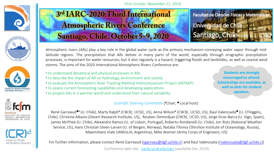IARC-2016 was hosted by CW3E in June 2016 at Scripps Institution of Oceanography’s beautiful “Seaside Forum” next to the beach in La Jolla, California. (The committee decided it was important for the event to be self-sustaining through use of registration fees, and that the fees would include support for 10 student scholarships that would cover their registration costs.) IARC-2016 brought together 100 attendees who shared results and ideas in 75 presentations over four days. Participants recommended IARC be held again in 2018. Once again CW3E hosted the conference at Scripps, this time in June 2018 with 125 attendees sharing 100 presentations. Once again attendees recommended IARC be held again in 2020. This time the decision was made to hold it overseas, and with the gracious offer from Dr. Rene Garaud of Univ. of Chile, Santiago, to host the conference, it was decided to hold IARC-2020 in Chile. As of late 2019 the steering committee had been formed and the dates had been set for October 2020. It is envisioned that henceforth IARC will be held every other year, alternating between Scripps in La Jolla, and an international location.